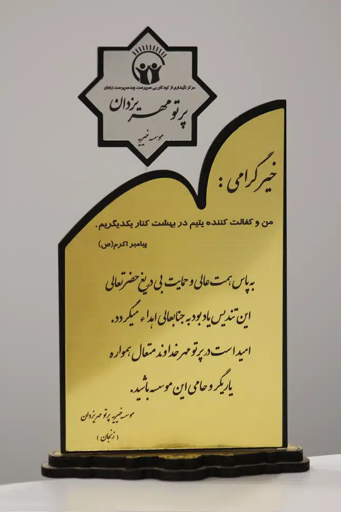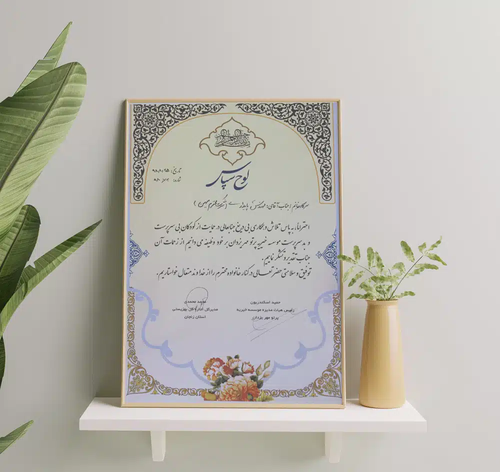 Zanjan Welfare Organization Certificate of Appreciation for Caring and Breeding orphaned children