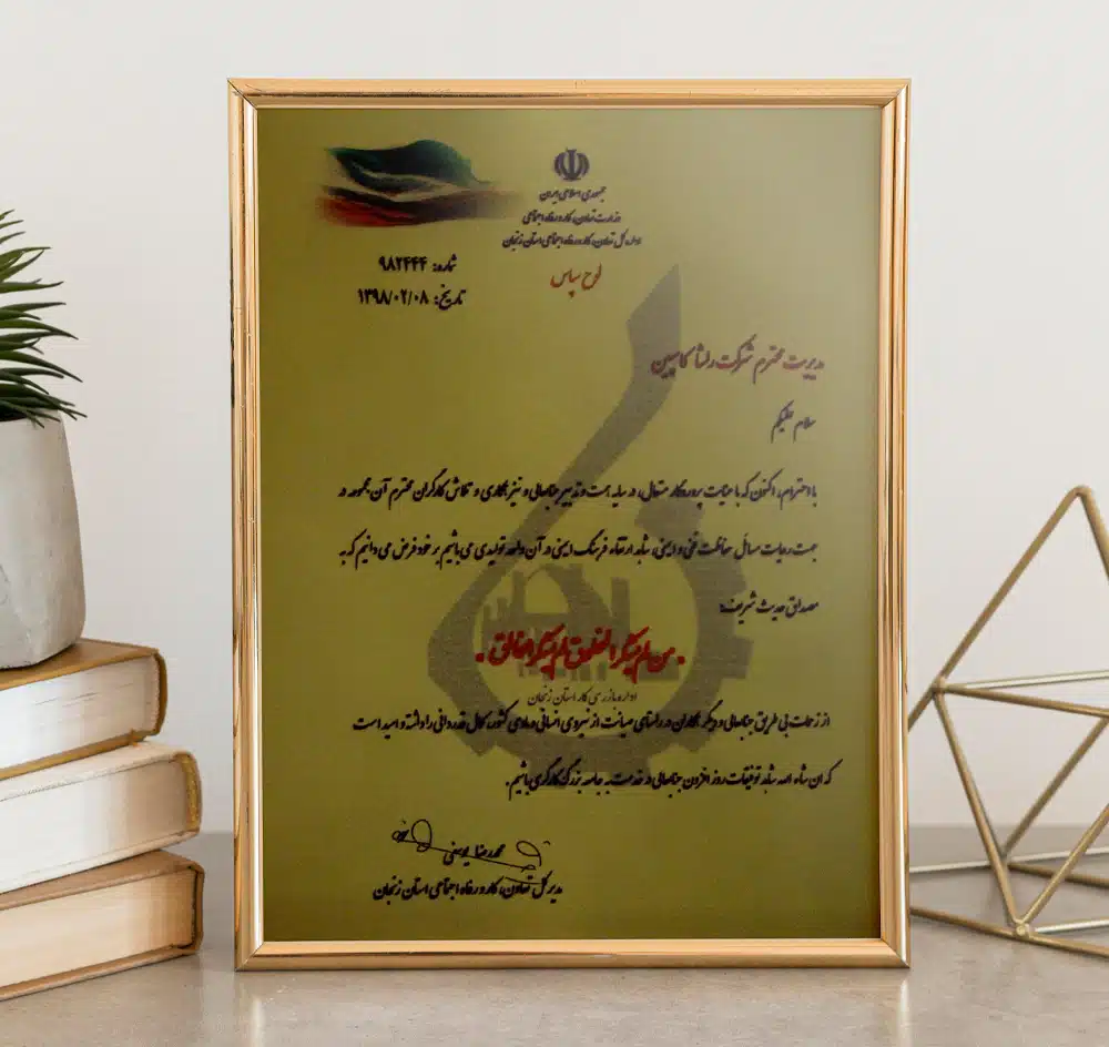 Zanjan Director General of Labor and Social Affairs Certificate of Appreciation for Safety Issues